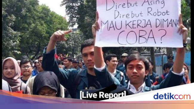 bertuliskan “DIREBUT ASING, DIREBUT ROBOT, MAU KERJA DIMANA, COBA?”.